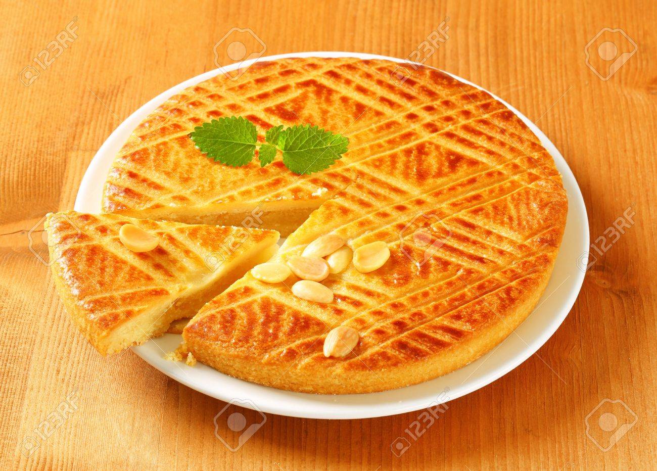 - Tuang ke dalam loyang kotak 22 * 22 cm yang sudah diolesi atau diberi kertas roti, ratakan dengan spatula. Olesi dengan kuning telur, kerat-kerat memanjang dengan garpu, dan taburi almond.